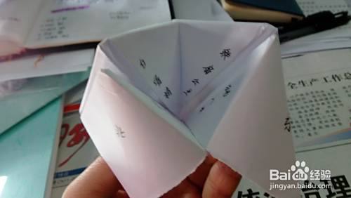 将四个角套在两只手的大拇指和食指上,左右前后就能自由开合。让后让对方点一个手指,说一个数字,左后开合数次,就能看到对方心里想的了。