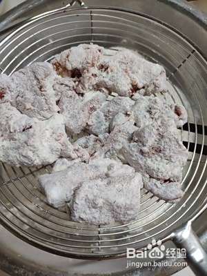 再把过水的鸡肉块,放入面盆里,轻轻抖动盆,再裹上一层面粉,这样反复做两次就裹好啦|ω・)و ̑̑༉