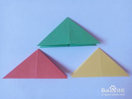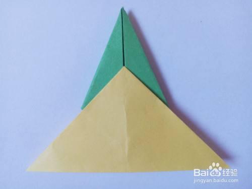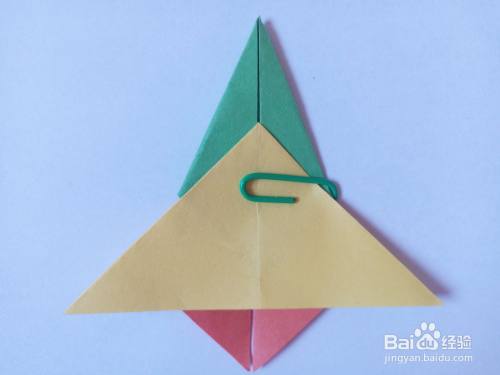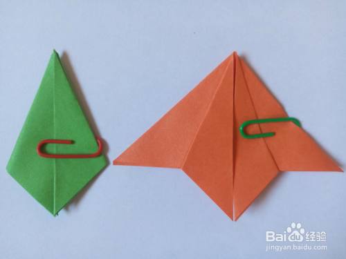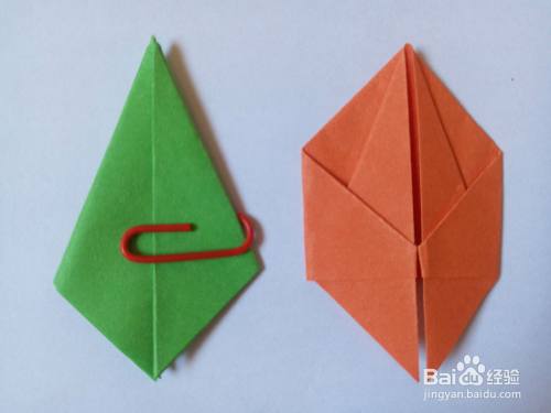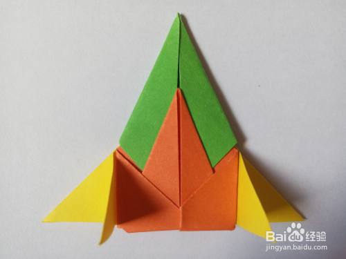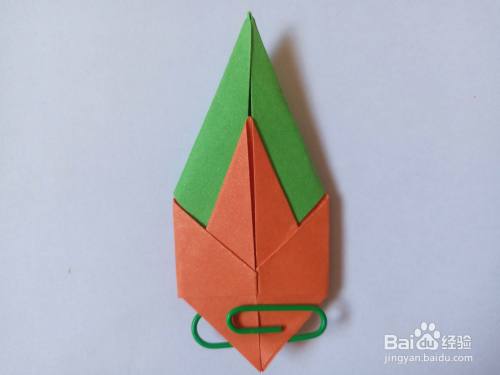 将橙色纸的两个角向中间折叠,将小角折叠到缝里。