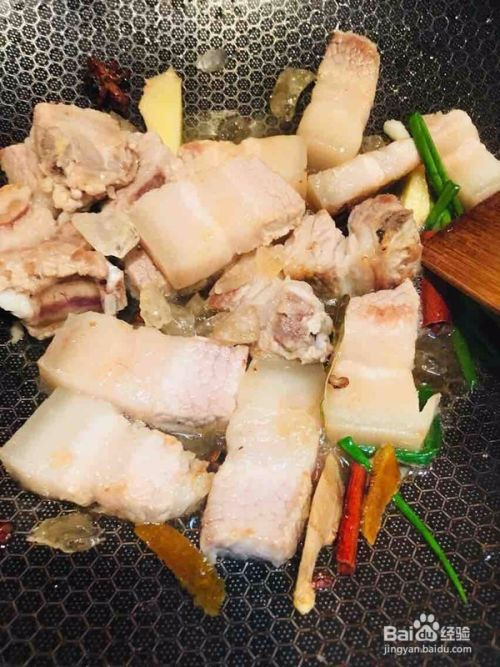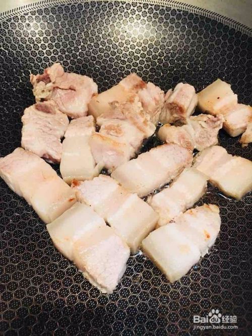 将焯过水的五花肉放入锅,中小火煎制五花肉出油,将渗出的多余油脂倒出,