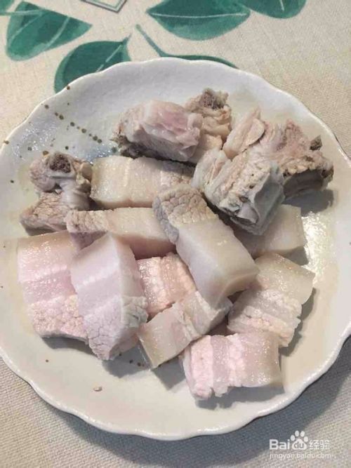 五花肉提前清水浸泡2小时,中间换3-4次水,待血水泡出后洗净,切成两指宽的方块,将五花肉块冷水入锅,放入姜片、葱段、花椒,待水煮沸后撇去浮沫,挑出姜片、葱段和花椒,捞出五花肉块备用;