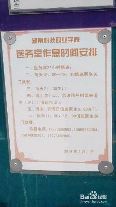 下面是医务室的工作时间,但有时医生有事也会不在,但门上随时都会有值班医生的电话,可以随时打电话给医生的。