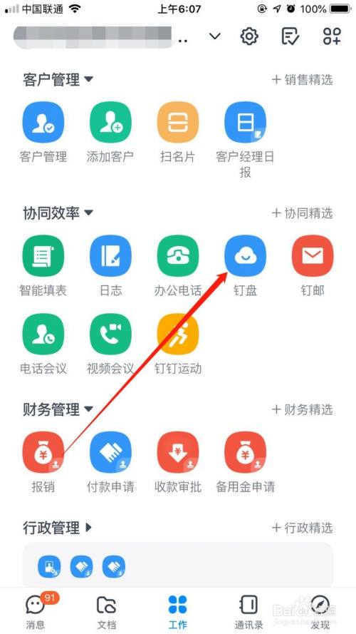1、首先打开钉钉,在工作页面中点击“钉盘”进入。