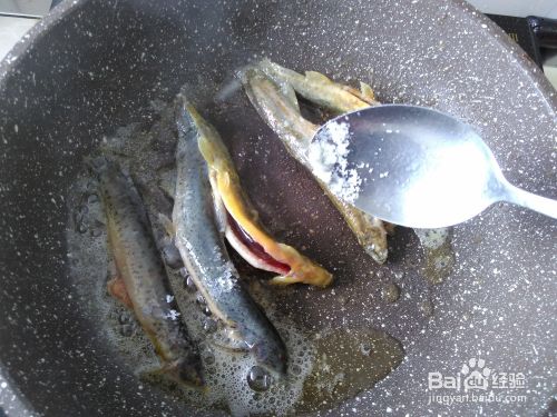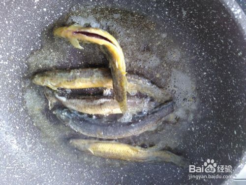 热锅下油,把泥鳅放到锅里,撒适量的盐,用小火煎至微黄色。