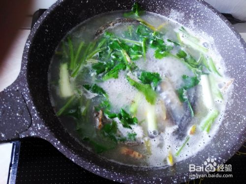 3、滚至汤水变成奶白色,然后加香葱白、香菜进去即可。