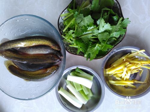 泥鳅最好选择活蹦蹦野生的,买回来要用水活2天,等泥鳅把里面的东西排完出来。泥鳅、姜丝、香葱白、香菜准备好。