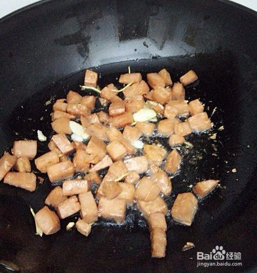 把锅烧热,放油,把火腿丁炸成金黄色。