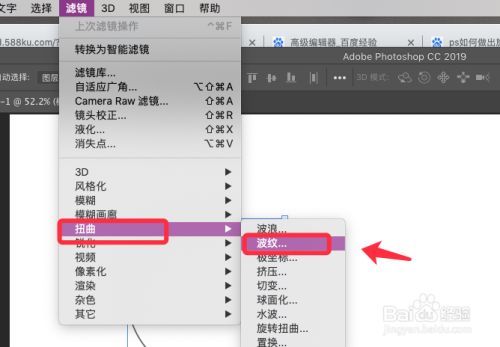 点击上方菜单栏的滤镜,扭曲,选择波纹。