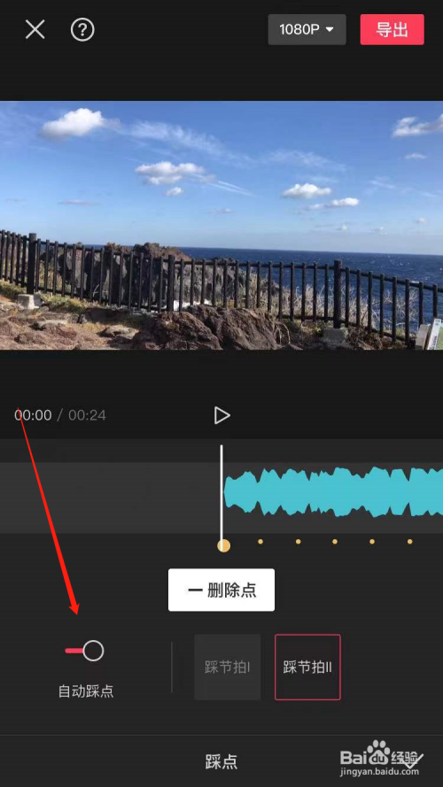 打开踩点按钮,可选择自动踩点同时可根据需要自己删除和增加卡点,也可调整视频对应卡点位置。