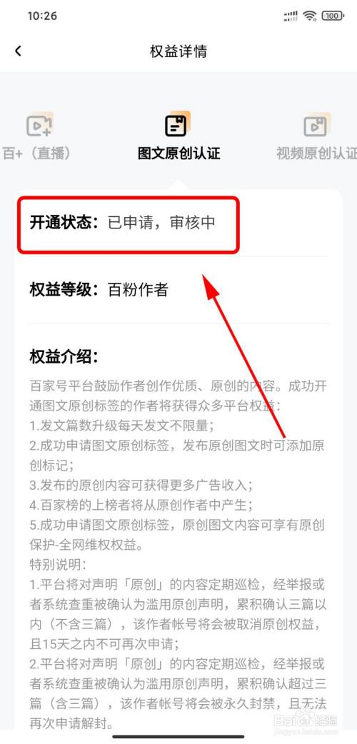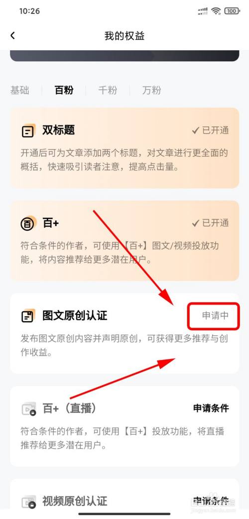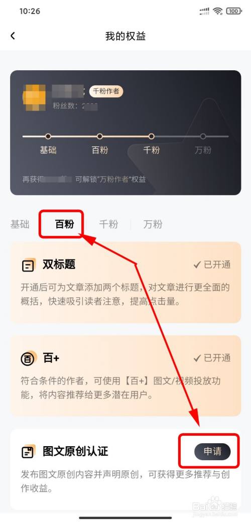 【百粉权益】下,有【图文原创认证】,点击【申请】。