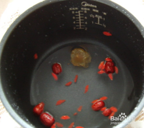 首先将电饭煲内胆加水,放上清洗好的红枣枸杞。