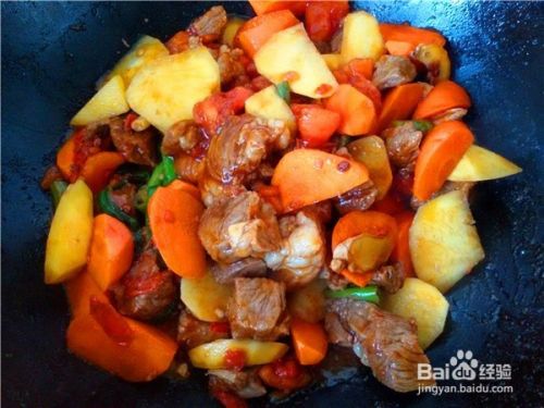 再加入土豆块和胡萝卜块,调入适量的盐、老抽和生抽,翻炒均匀。