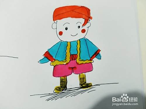 第六步,我们来拿出画笔为卡通少数民族男孩涂上漂亮的颜色,如下图