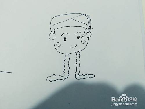 第四步,我们来画卡通男孩的身体轮廓和双脚,如下图