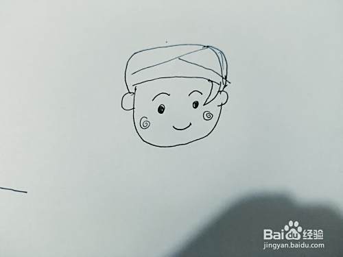 第一步,我们来画男孩的头部,以及眼睛,鼻子和嘴巴,如下图