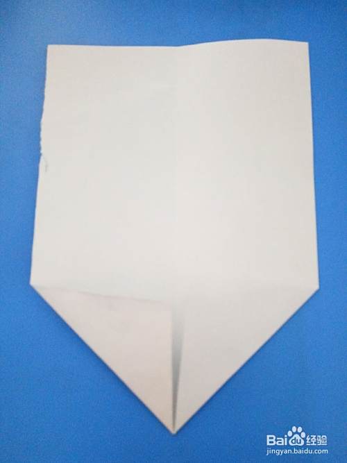步骤2对折之后,中间会有一条中线,按照这条中线,把长方形折纸下面的两个角往里折,折出两个三角形。如图。