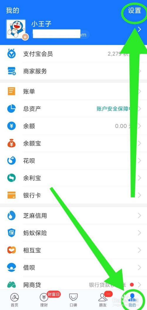 第一步:打开支付宝app,进入首页后,点击右下角的“我的”,然后再点击右上角的“设置”;
