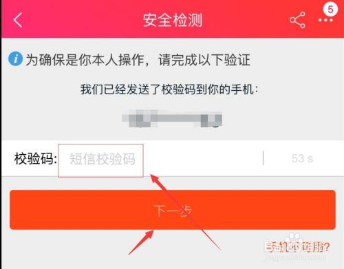接着,进入安全检测界面,在界面中,输入系统发送的短信验证码,完成后,点击下方的“下一步”。如图: