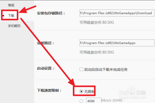 3、在WeGame点击列表图标,点击系统设置——下载——无限制。这样可以进行全速下载。