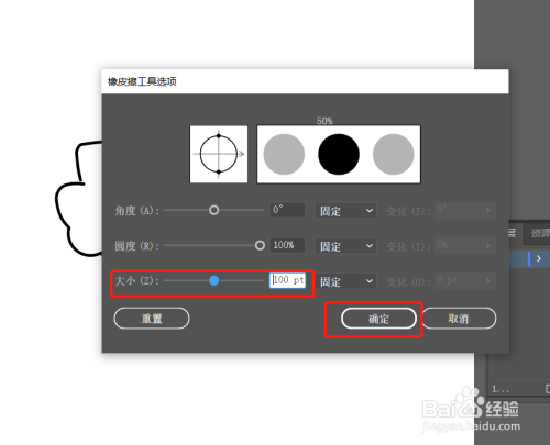 鼠标点击大小后面的滑块,享有调整,增大橡皮擦工具,点击确定即可完成。