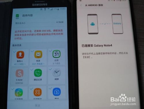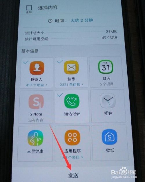 在旧手机上显示了可以传输的全部内容,如图所示,默认都勾选了,我们把不想传输的内容取消掉,手机会显示要传输的内容大小和大约的时间,然后点击下面的“发送”。