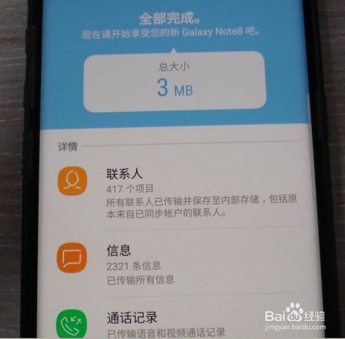 旧手机把备份内容全部传输至新手机上后,会显示“全部完成”,如图所示,新手机开始保存接收的数据,会显示进行到哪步,并以百分比显示。