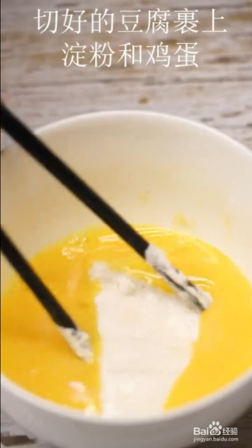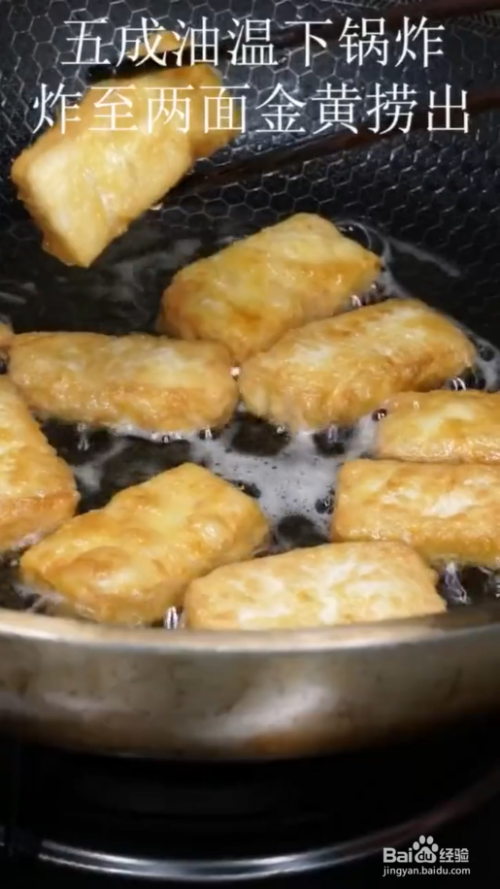 切好的豆腐裹上淀粉、鸡蛋,五成油温下锅炸,炸至两面金黄捞出。