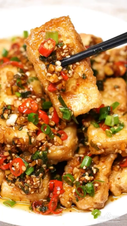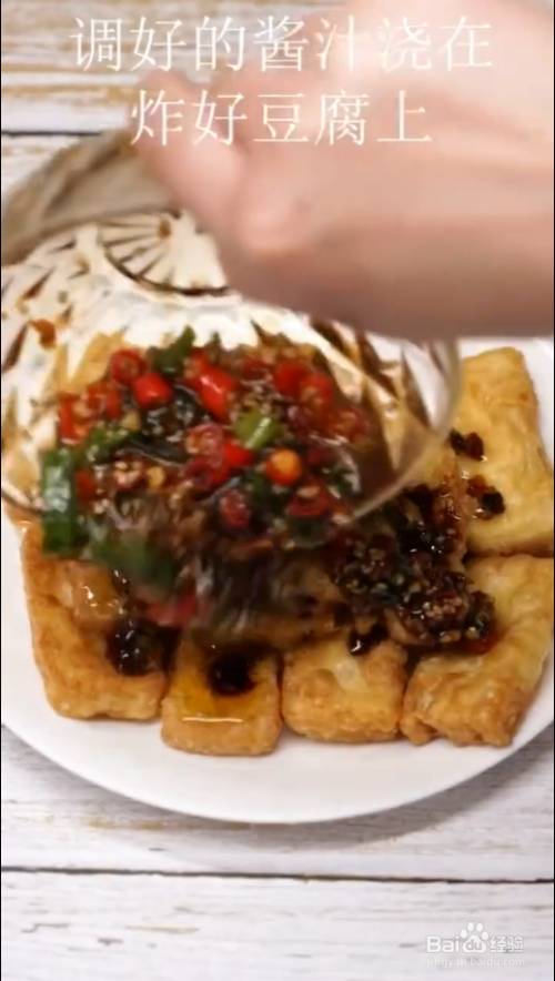 调好的酱汁浇在炸好的豆腐上,好吃的豆腐就做好啦。