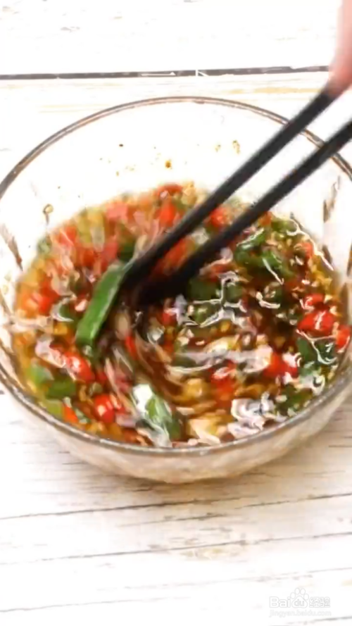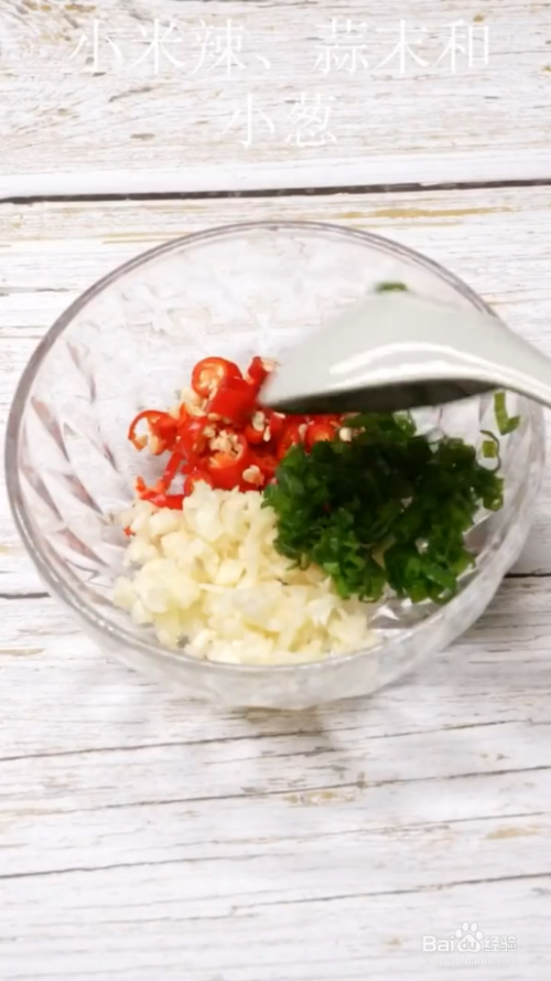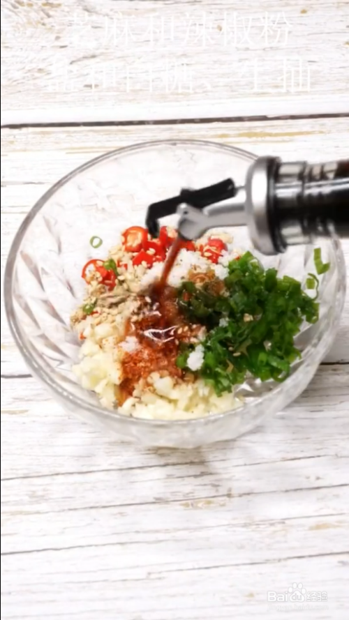 碗中放小米辣、蒜末和小葱,芝麻和辣椒粉,盐和白糖,生抽,浇上热油搅拌一下。