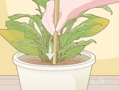 准备使用股份来支持新工厂。重新盆栽后,植物的根不会立即在其新土壤上牢牢地扎住。这可能会使您的植物难以保持直立。如果您在平衡植物时遇到困难,请使用坚固的木桩或木钉支撑和平百合的茎。将木桩埋入盆栽土壤中(注意不要损坏植物的根部),并用一根铁丝将茎杆绑在木桩上。当植物已经扎根并且能够独立站立时,移走木桩。