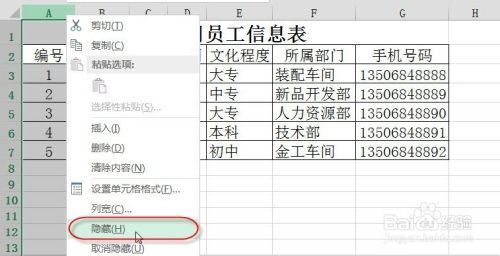 在A列标签上右击鼠标,弹出快捷菜单中选择“隐藏”,以后需要继续向表格中添加记录时,可以再次显示出来。