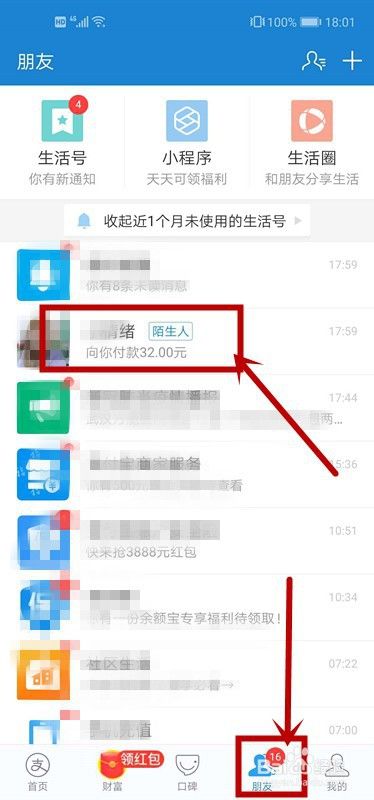 6、点击支付宝页面底部的【朋友】按钮,在消息列表中就可看到对方的收款信息;