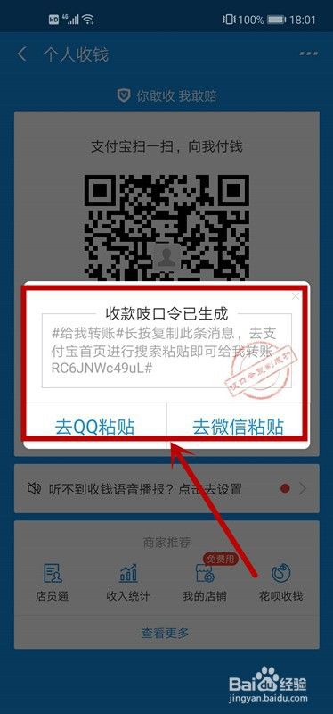 当然,您还可以选择【向微信/QQ朋友收款】,然后就会生成收款吱口令,届时将吱口令粘贴到对方账户的QQ或微信上,等着对方付款就行了。