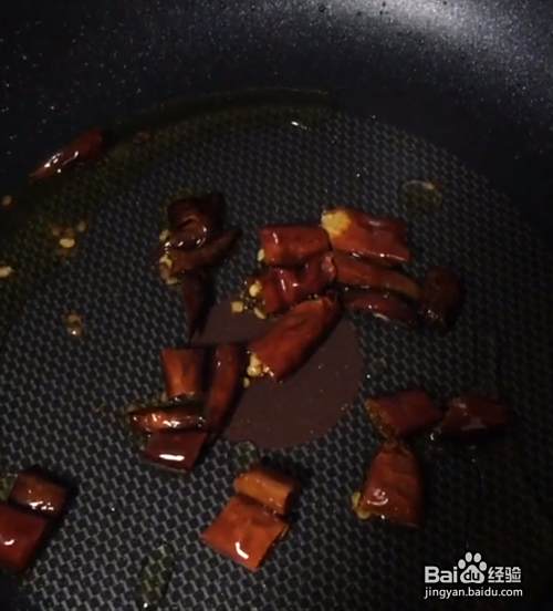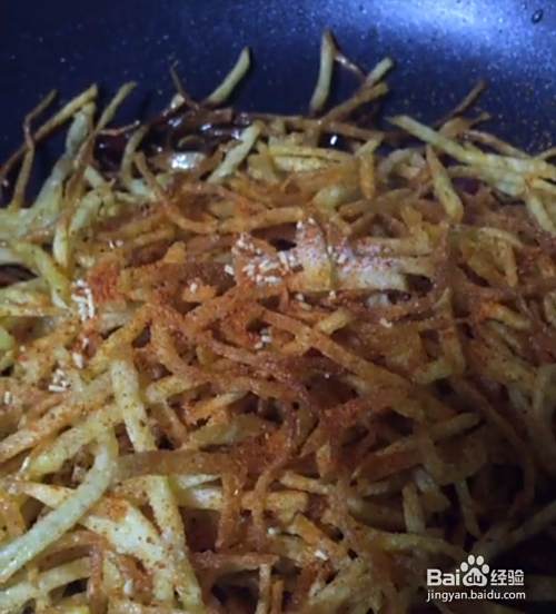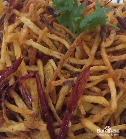 锅中留底油,下入辣椒段,放入炸好的土豆丝。