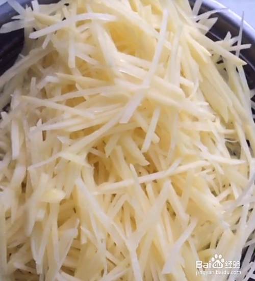 土豆洗净,切成丝,洗出淀粉,控干水分。