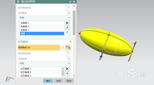 使用通过曲线网格,主曲线选择椭圆交点处的两个点和中间的艺术曲线,记得选择一次后按中键。交叉曲线依次选择椭圆的上半部分和下半部分,且两个椭圆都要选择。顺时针或者逆时针都可以。如图所示;