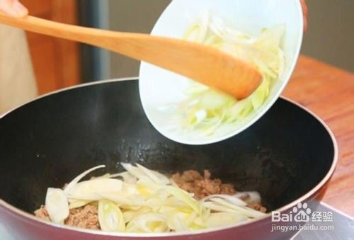 然后翻炒至葱丝变软后,接着倒入剩下葱丝一起炒。