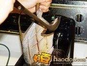 炒锅上火,一手拿着鱼,一手用油往鱼身上淋使其定型。