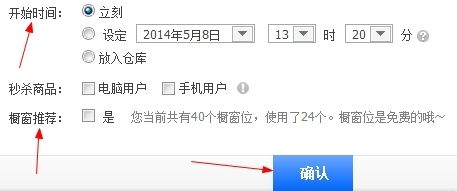 在页面的低端,有开始时间选项,这里您可以编辑宝贝的上架时间。最下面是是否橱窗推荐,这要看你的实际情况,如果你你希望将该宝贝加入橱窗推荐,那么就在前面打钩,否则就不打钩。最后,点击确认按钮即可。