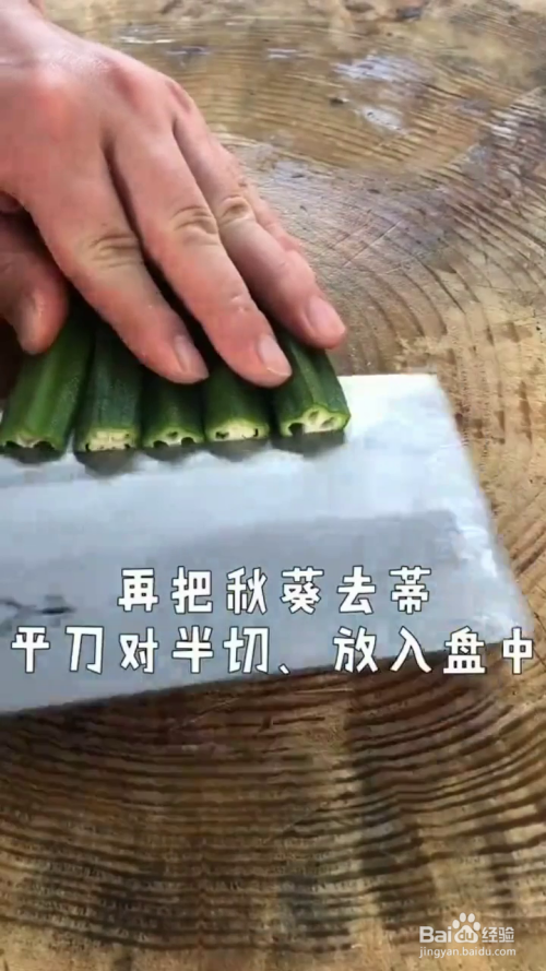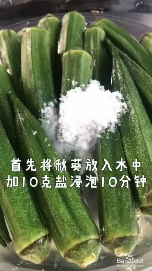我们将秋葵放入清水中加入食盐浸泡十分钟,接着去头,将秋葵片开,一分为二摆入盘中