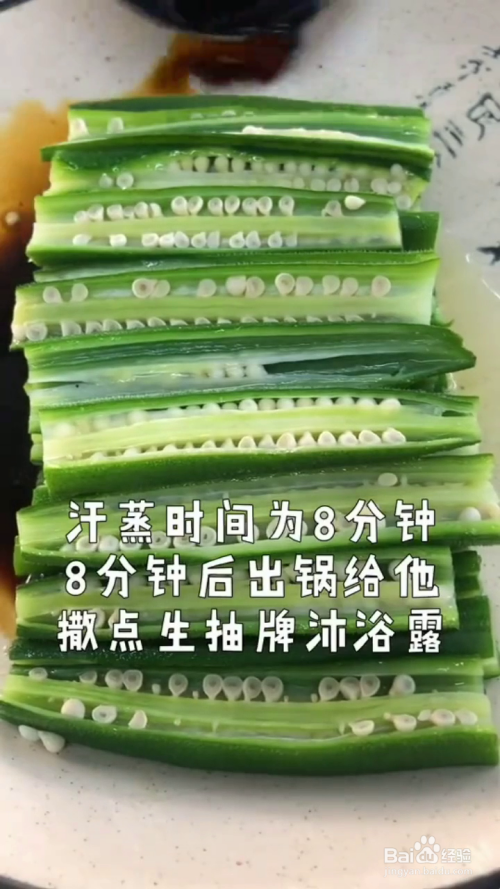 接着将它们上锅上汽蒸八分钟,取出在秋葵上面淋上适量的生抽