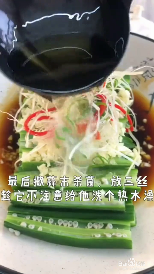 接着放上蒜末,葱姜丝和红椒丝,再将油烧热,淋在三丝上面即可开吃啦