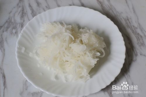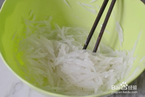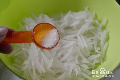 事先用擦丝器将去皮白萝卜擦丝,然后加入一小勺的盐和少许的糖腌制5分钟左右