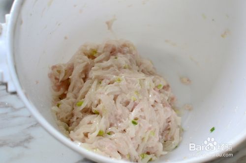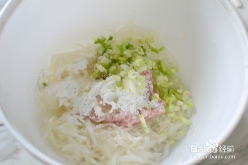 将这些材料和肉泥(3肥7瘦)、调料一起放入盆中