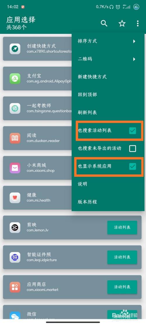 二、勾选“也搜索活动列表”和“也显示系统应用”
