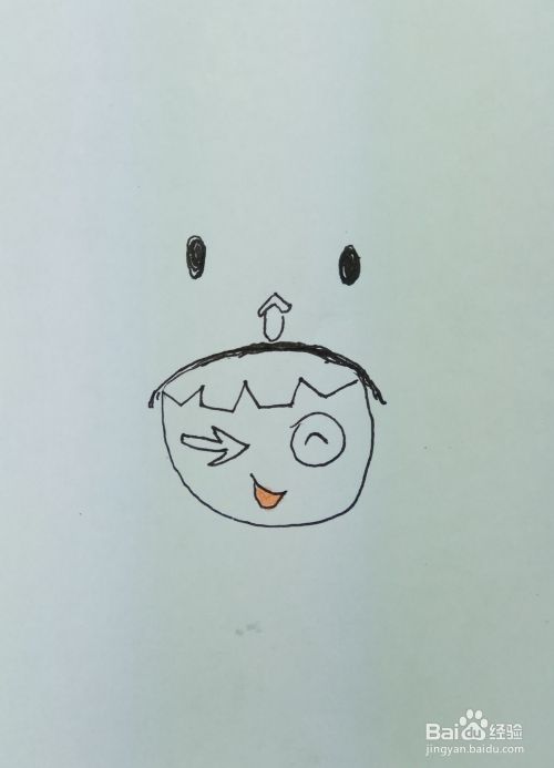 在白纸上用线条和曲线画出一个小女孩的头部轮廓,画出她的眼睛,鼻子和刘海,还有她头上的演出服帽子。
