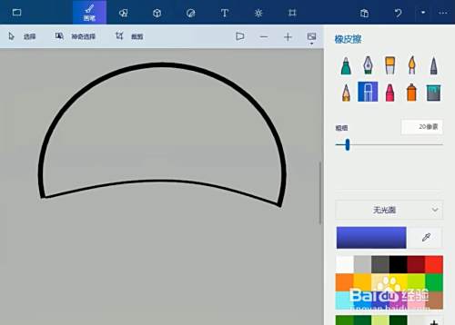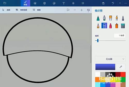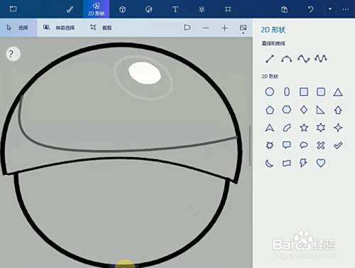 打开画图3D程序,选择菜单上的2D形状,单击四点曲线工具,画一条带弧度的线,作为头盔的帽沿,然后用圆形工具,画一个正圆,放在弧度线的上面,和弧度线拼在一起,形成一个头盔,擦掉多余的线条。