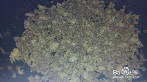 鸡蛋打散后,点火,热锅,将鸡蛋滑散,注意尽量块小一点哈!然后借着这个油把虾皮煸炒一会,再然后倒入肉馅,滑散 ,需要注意的是,一直要保持小火,慢慢煸熟。