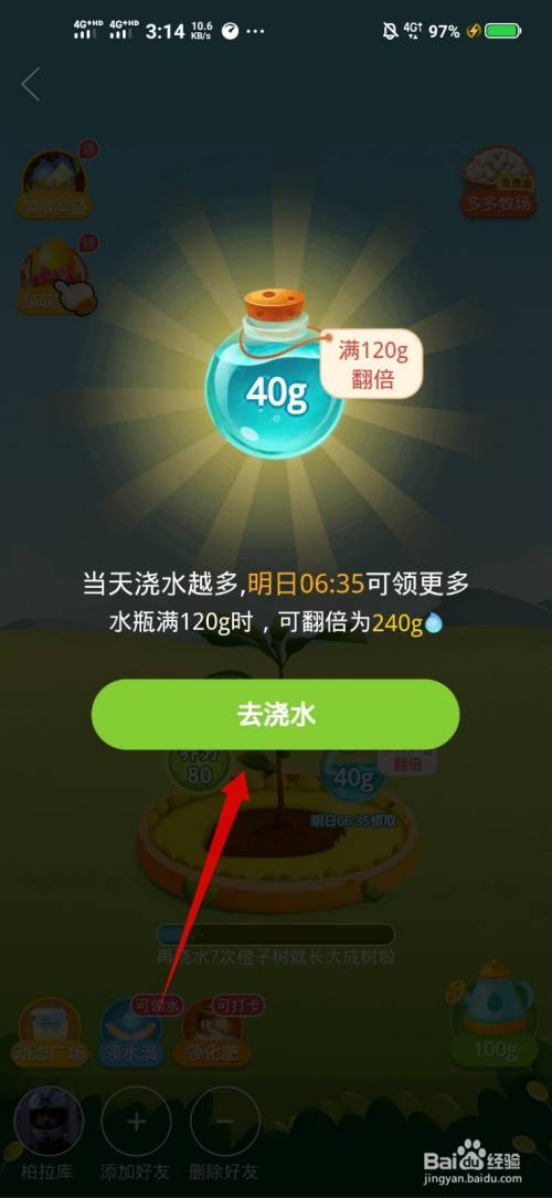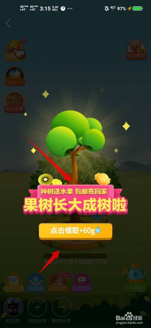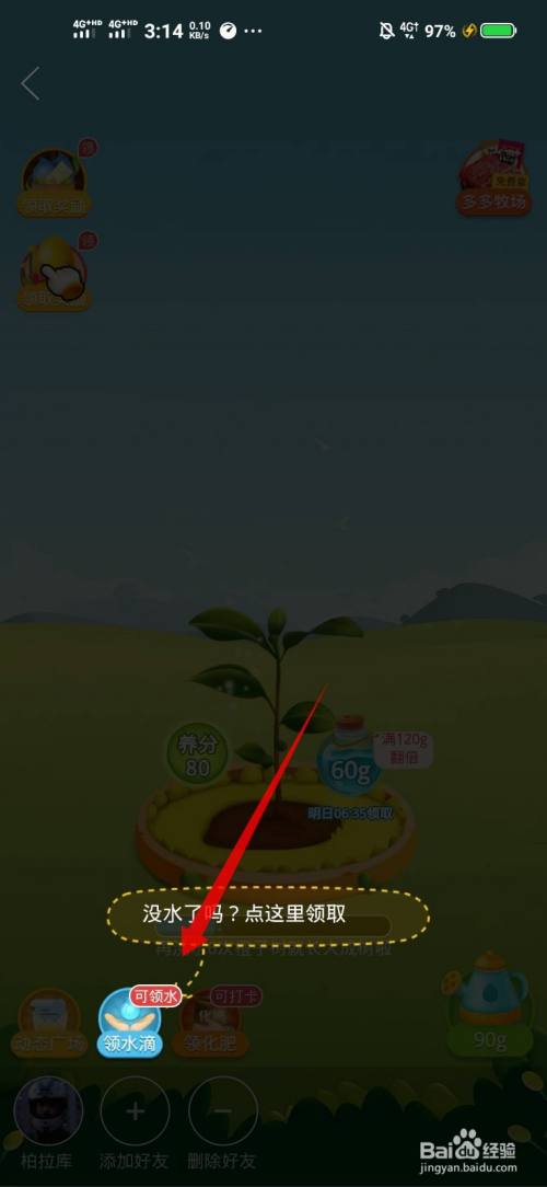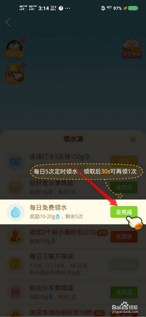 每天完成一定量的任务,领取水滴。领到水滴继续给果树浇水。