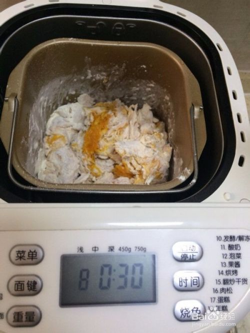 捣碎的南瓜泥凉凉倒入面包机里,加入面粉用筷子搅拌一下再倒入酵母。